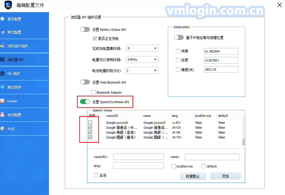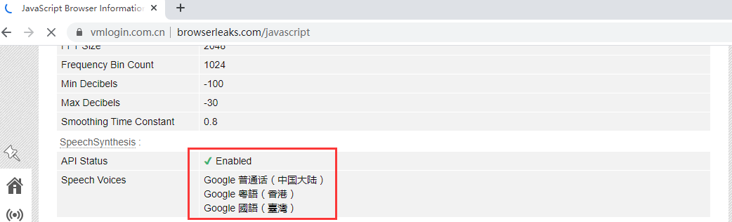 当有些网站有使用这类技术来取 Speech Voices 列表时,那 vmlogin 就可以自定义其指纹。