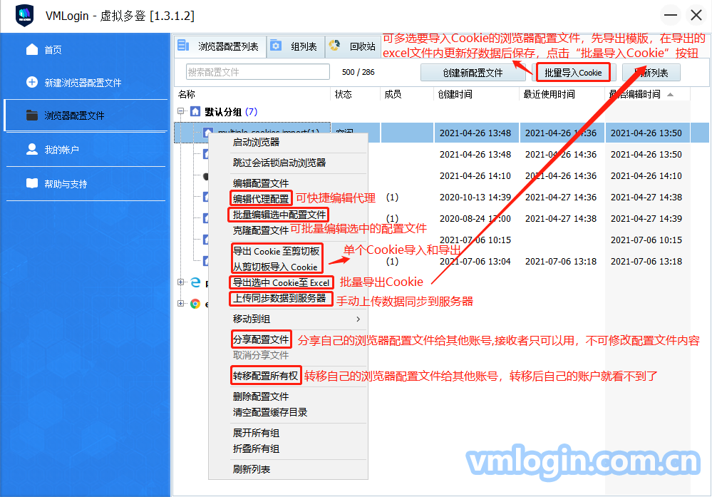 快捷编辑代理配置,批量编辑选中配置文件,Cookie导入导出,手动上传数据同步到服务器,配置文件分享,转移等功能如下图所示
