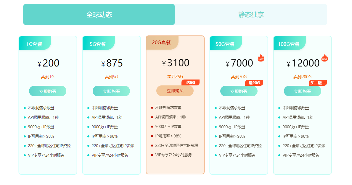 3、购买IP:打开 ipidea.net 官网 -> “套餐购买”页面 -> 立即购买 -> 根据业务需求选择IP类型;动态IP直接购买;静态IP根据所需国家、数量和使用时长进行购买。