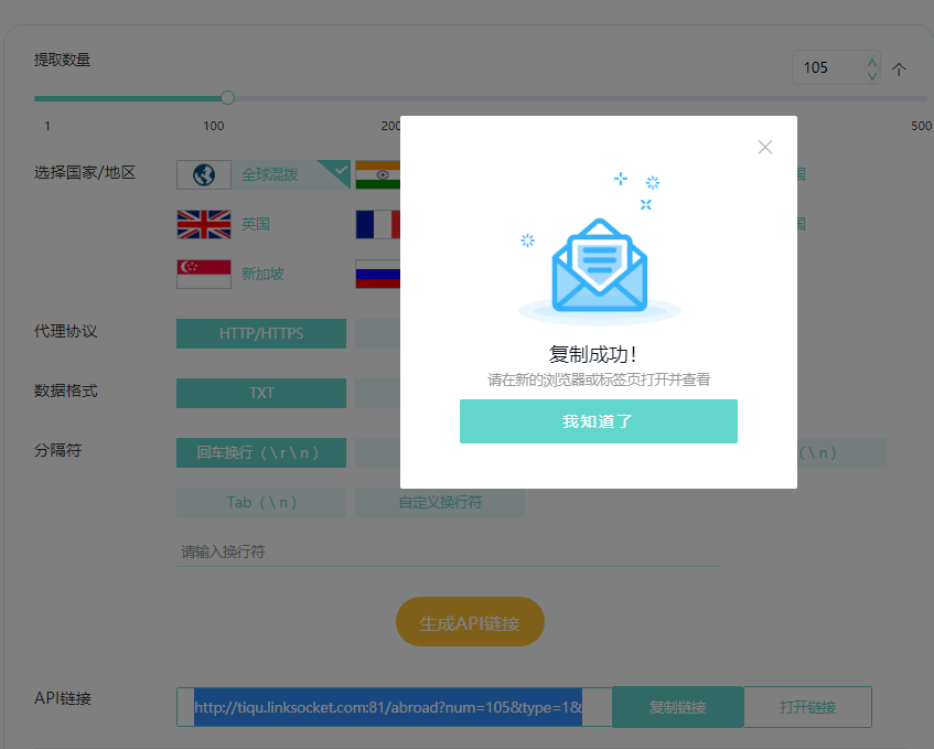 4、购买成功后在“代理获取”页面,选择API获取,生成API链接。打开后获取到的IP+端口号进行复制。