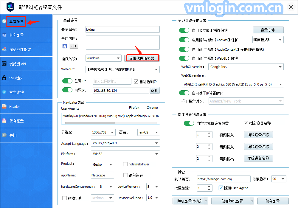 2、打开VMLogin,如下图,新建浏览器配置,点击获取随机浏览器配置,也可根据自己的需求选择。