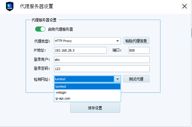 检测网址:默认为3个 lumtest 、vmlogin、ip-api.com,选择后点《测试代理》按钮,可以优先走选择的网址来测试IP。