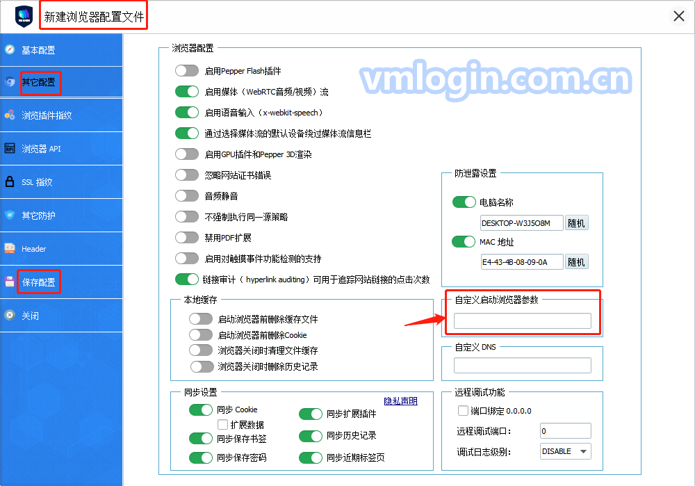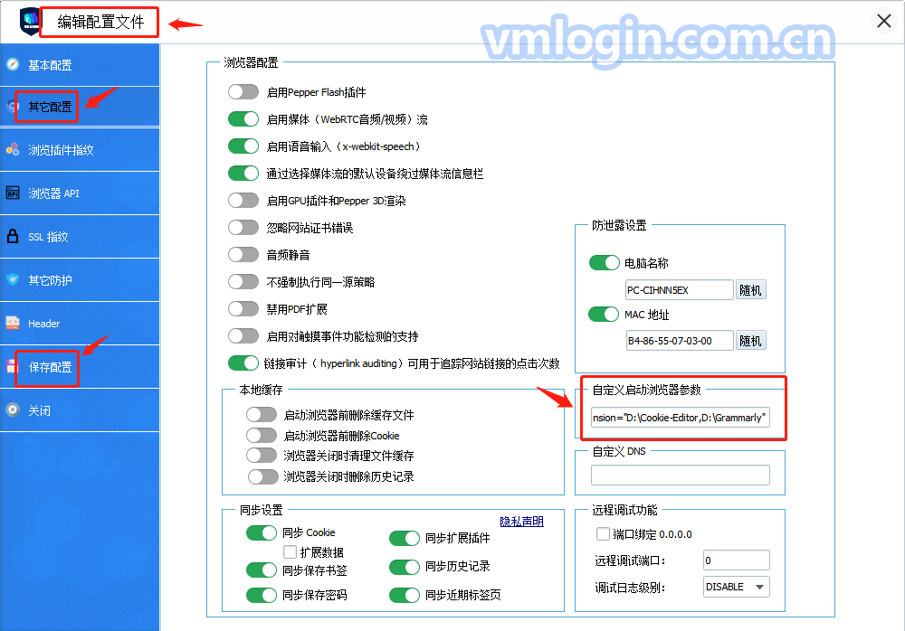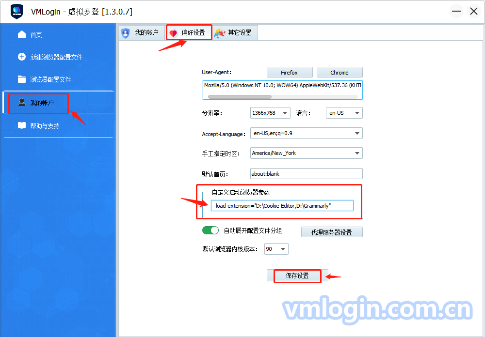 2、打开VMLogin客户端,我的账户->偏好设置->在“自定义启动浏览器参数”中设置插件参数->保存设置,例如: