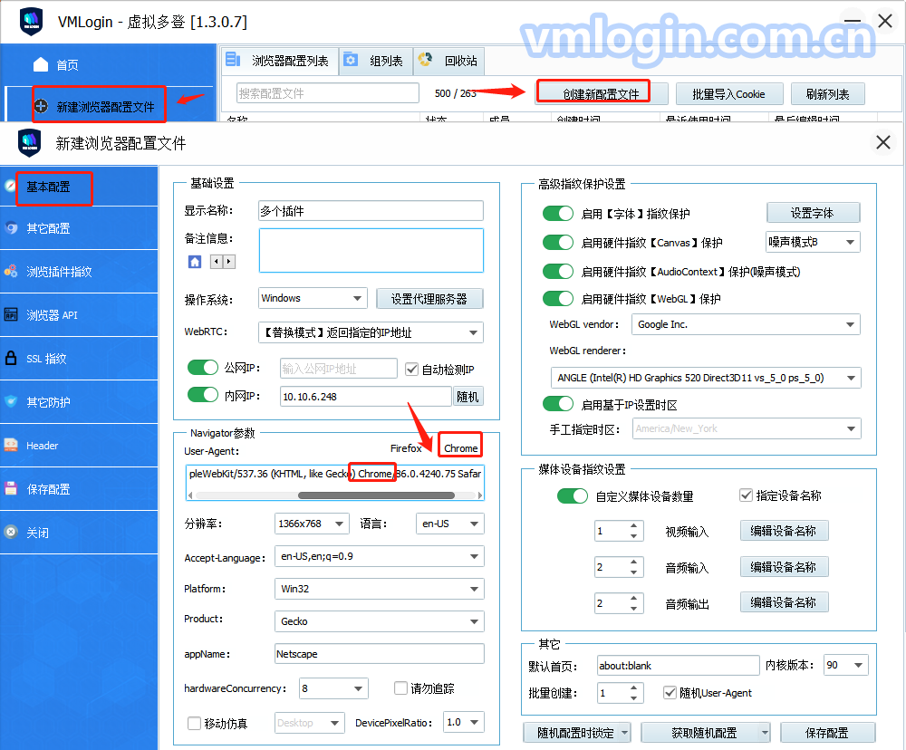 1、打开VMLogin客户端,新建一个配置文件,您可点击“新建浏览器配置文件”或者“创建新配置文件”去创建新的配置文件。