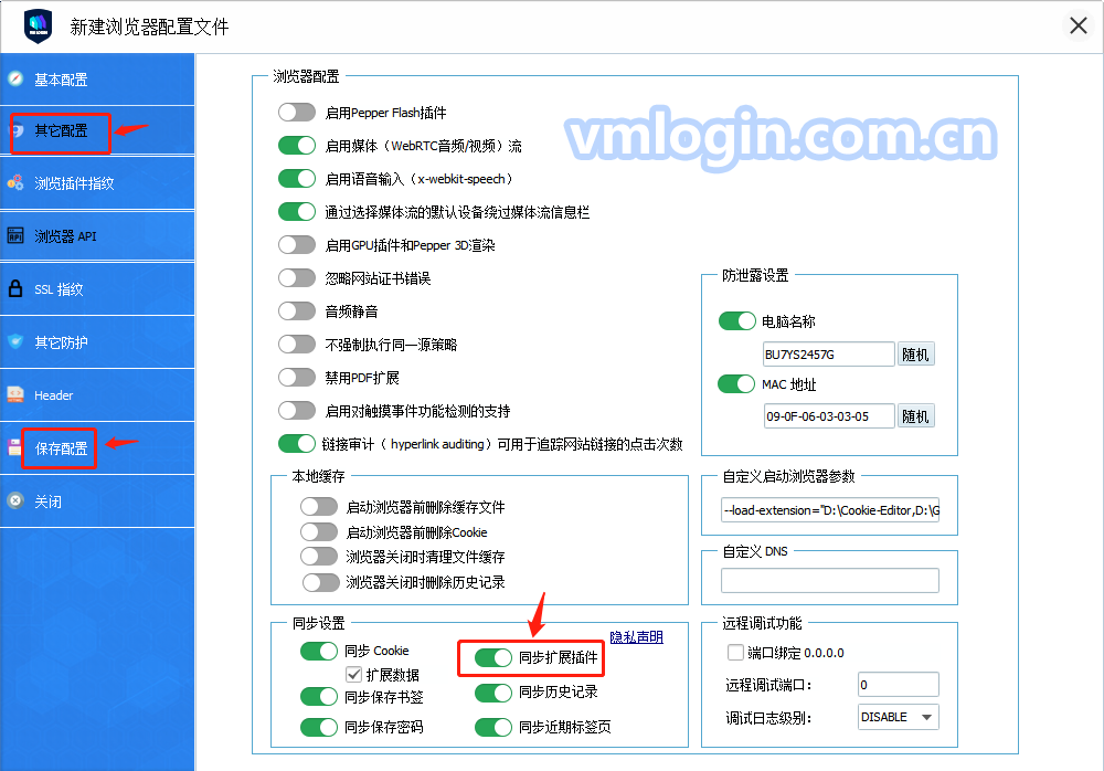 3、其他设置 -> 打开同步设置 -> 打开同步扩展插件 -> 保存配置,同步设置打开后,将浏览器配置文件分享给子账户或其他账户,对方打开浏览器配置文件后,插件也会自动加载。