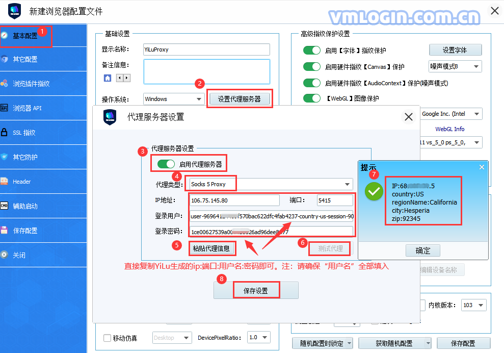 复制生成的IP:端口:用户名:密码,然后粘贴到VMlogin浏览器配置文件设置中即可(代理类型Socks5或HTTP);