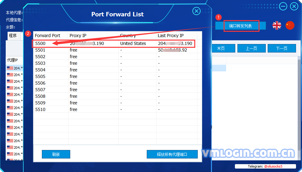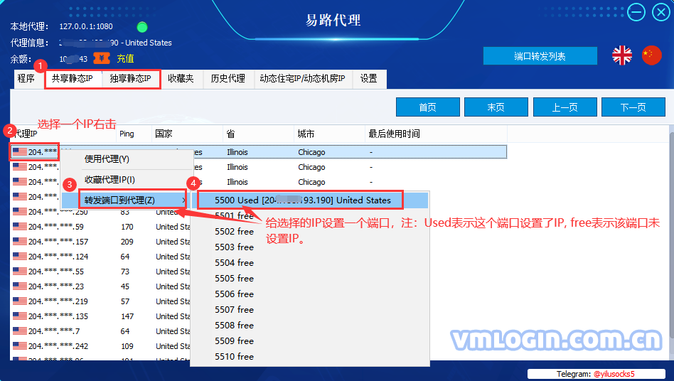 选择自己所需“端口”, 每个端口只可以设置一个IP,可随时为该端口更换IP;